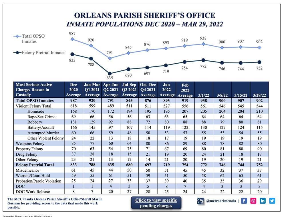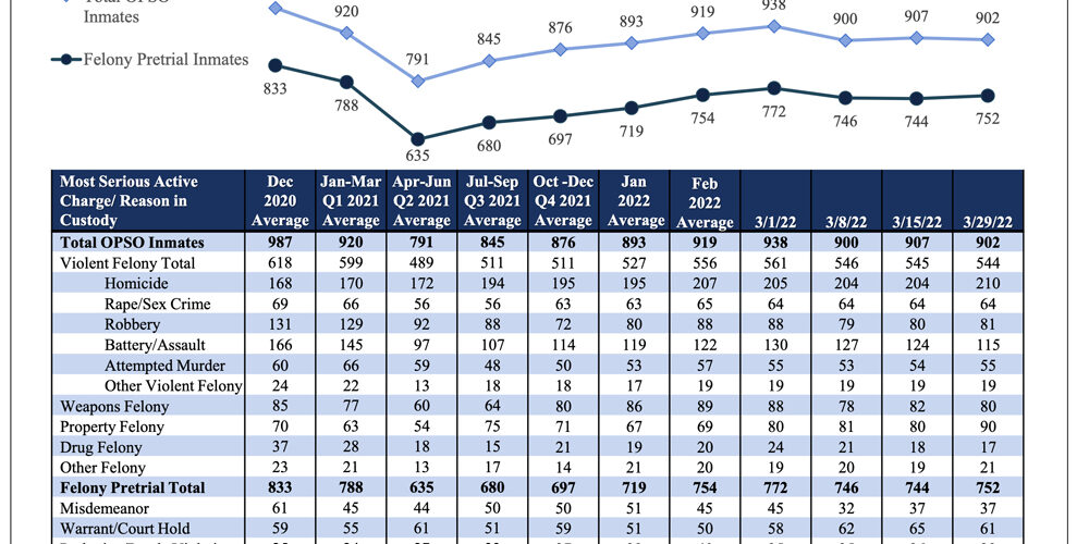 Mar282022Inmate Data Inmate Population Highlights: 210 (23% of inmates) awaiting trial on murder charges 544 (60% of inmates) awaiting trial on violent felony charges 752 (83% of inmates) awaiting trial on any felony charge March 28, 2022 Share this post Share on FacebookShare on Facebook Share on XShare on X Share on LinkedInShare on LinkedIn Post navigationPreviousPrevious post:2022, March 28 ProsecutionNextNext post:2022, April 4 Prosecution