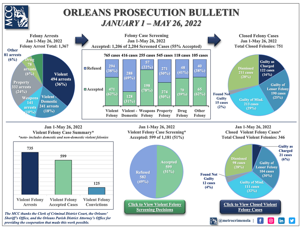 Only 36% of violent felony cases end with a felony conviction – 6% guilty as charged, and 30% pled/found guilty of lesser felonies –60% of all violent felonies end in dismissal or misdemeanor plea deals