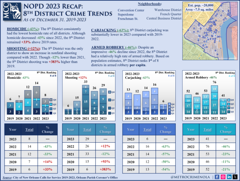 2023 Recap Series: 8th NOPD District-Level Violent Crime Trends NOPD DistrictsJanuary 19, 2024 2023 Recap – NOPD DIstrict-Level Violent Crime Trend – FULL – Download full PDF The 8th… Read more
