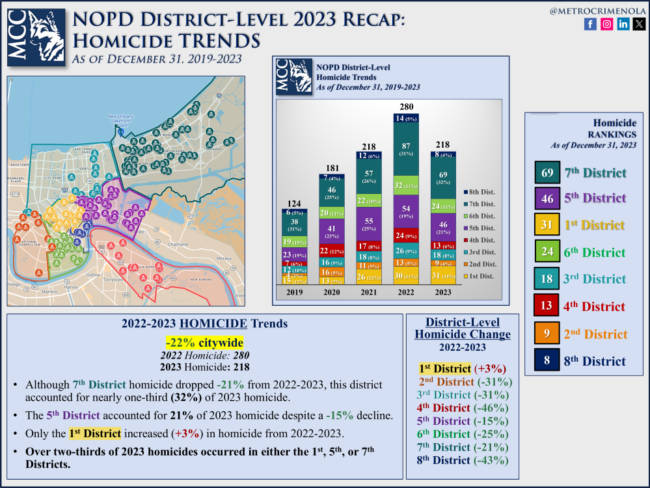 2023 Recap – NOPD DIstrict-Level Violent Crime Trend – FULL – Download full PDF The 3rd District ranks 5 of 8 NOPD Districts on HOMICIDE, 7 of 8 NOPD Districts on NONFATAL SHOOTING, and 8 of 8 NOPD Districts on ARMED ROBBERIES. However, this district ranks 1st of 8 NOPD Districts on CARJACKING, the only NOPD…