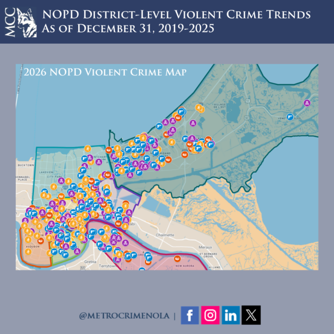 Download Report PDF View District Maps 2025 Crime Maps NOPD Districts – Neighborhoods & Boundaries Aggregate Violent 2019-2025 Homicide 2019-2025 Nonfatal Shooting 2019-2025 Carjacking 2019-2025 Armed Robbery 2019-2025 1st District 2nd District 3rd District 4th District 5th District 6th District 7th District 8th District