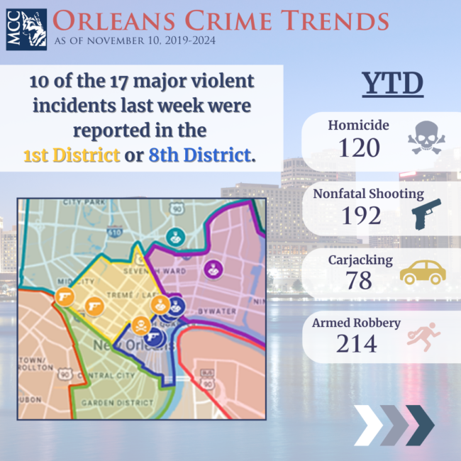 DOWNLOAD PDF Orleans Violent Crime Map November 11-17, 2024 (click to view) A note about homicides While we cross-check our numbers against coroner records, major offense logs, media reports, and any other source available, homicide numbers are subject to change as investigations progress. Homicides may be reclassified as “undetermined” if the coroner cannot definitively state…