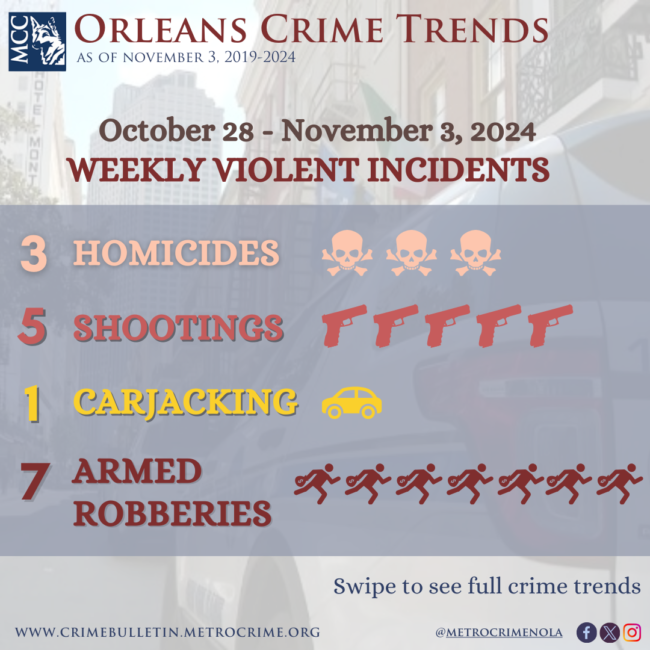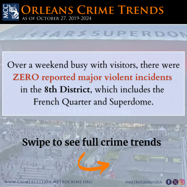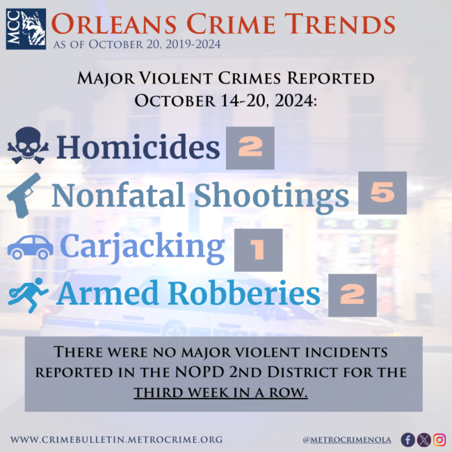 DOWNLOAD PDF Orleans Violent Crime Map October 28-November 3, 2024 (click to view) A note about homicides While we cross-check our numbers against coroner records, major offense logs, media reports, and any other source available, homicide numbers are subject to change as investigations progress. Homicides may be reclassified as “undetermined” if the coroner cannot definitively…