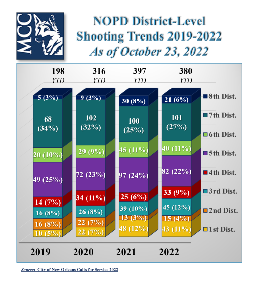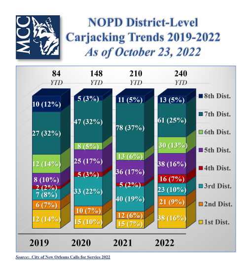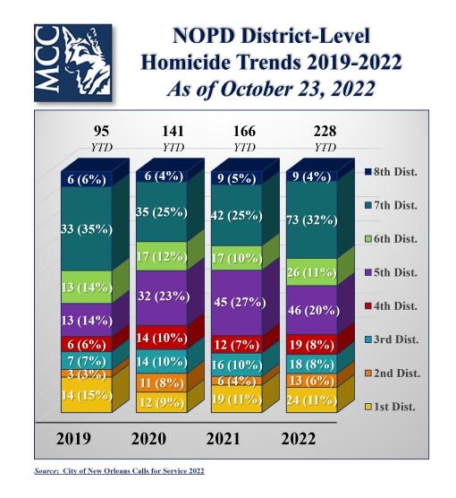 Eighth District Crime Trends as of October 23, 2022 Quick Facts Estimated population ~ 20,000 Area ~ 7.5 sq. miles Neighborhoods: French Quarter Central Business District The 8th District has the highest number of armed robberies per capita of any District (32 per 10,000 residents) Homicide by District Shooting by District Carjacking by District Armed Robbery by District October 27, 2022 Share this post Share on FacebookShare on Facebook Share on XShare on X Share on LinkedInShare on LinkedIn Post navigationPreviousPrevious post:Orleans Crime Trends as of October 23, 2022NextNext post:Seventh District Crime Trends – October 23, 2022