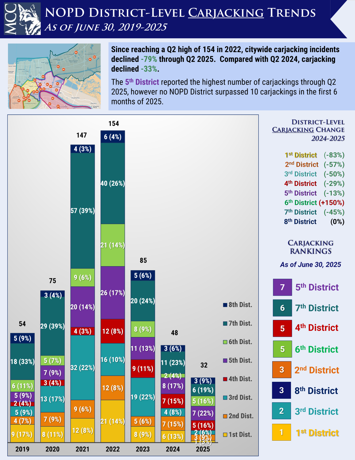 Download Report PDF July 14, 2025 Share this post Share on FacebookShare on Facebook Share on XShare on X Share on LinkedInShare on LinkedIn Post navigationPreviousPrevious post:OPSO Inmate Population: July 7, 2025NextNext post:NOPD District-Level Crime Trends – FULL – as of June 30, 2019-2025