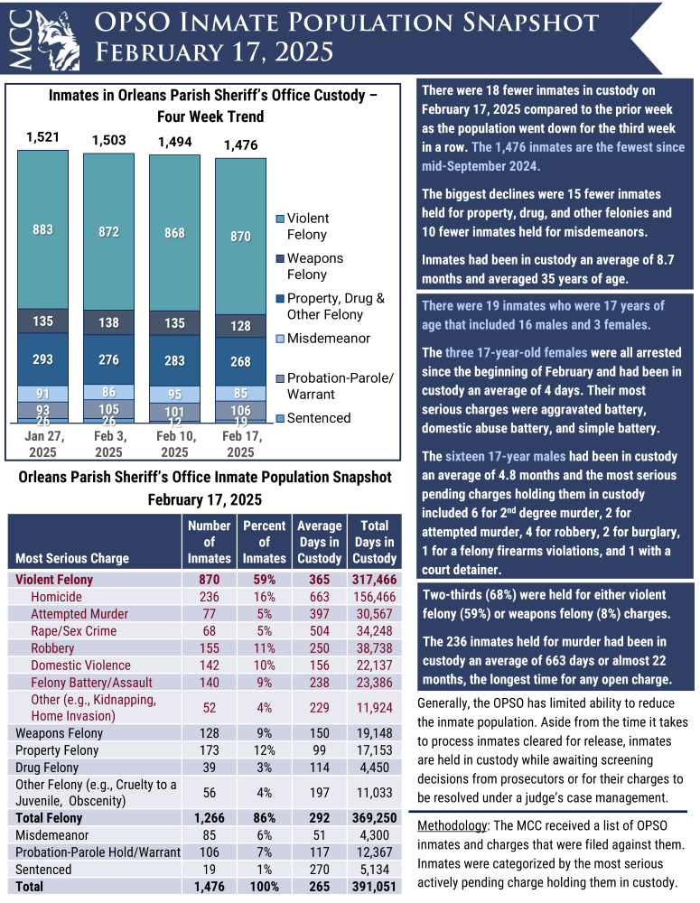 Download PDF February 19, 2025 Share this post Share on FacebookShare on Facebook Share on XShare on X Share on LinkedInShare on LinkedIn Post navigationPreviousPrevious post:OPSO Inmate Snapshot: February 10, 2025NextNext post:OPSO Inmate Population Snapshot: February 24, 2025