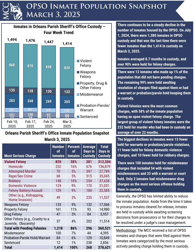 Download PDF March 7, 2025 Share this post Share on FacebookShare on Facebook Share on XShare on X Share on LinkedInShare on LinkedIn Post navigationPreviousPrevious post:OPSO Inmate Population Snapshot: February 24, 2025NextNext post:OPSO Inmate Population Snapshot: March 10, 2025