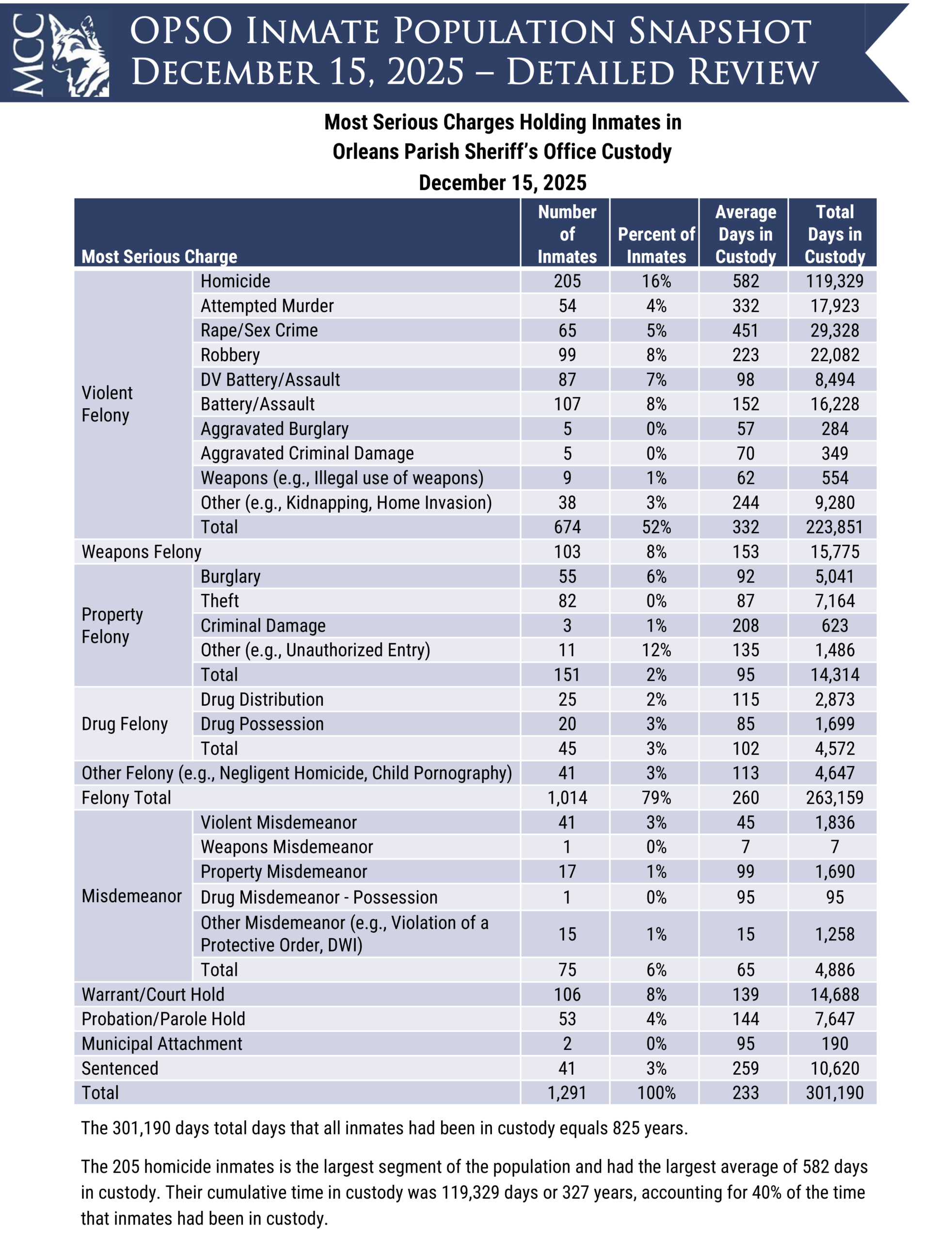Download PDF December 17, 2025 Share this post Share on FacebookShare on Facebook Share on XShare on X Share on LinkedInShare on LinkedIn Post navigationPreviousPrevious post:OPSO Inmate Snapshot: December 8, 2025NextNext post:Orleans Parish Inmate Snapshot: December 22, 2025
