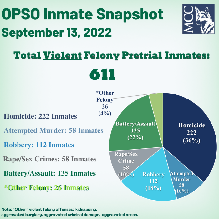 OPSO Inmate Snapshot September 13, 2022 Highlights Total Inmates: 1,040 85% (880 inmates) in custody on any felony charge 59% (611 inmates) in custody for a violent felony charge 21% (222 inmates) in custody for a murder charge September 13, 2022 Share this post Share on FacebookShare on Facebook Share on XShare on X Share on LinkedInShare on LinkedIn Post navigationPreviousPrevious post:Seventh District Crime Trends as of September 11, 2022NextNext post:Sixth District Crime Trends as of September 11, 2022