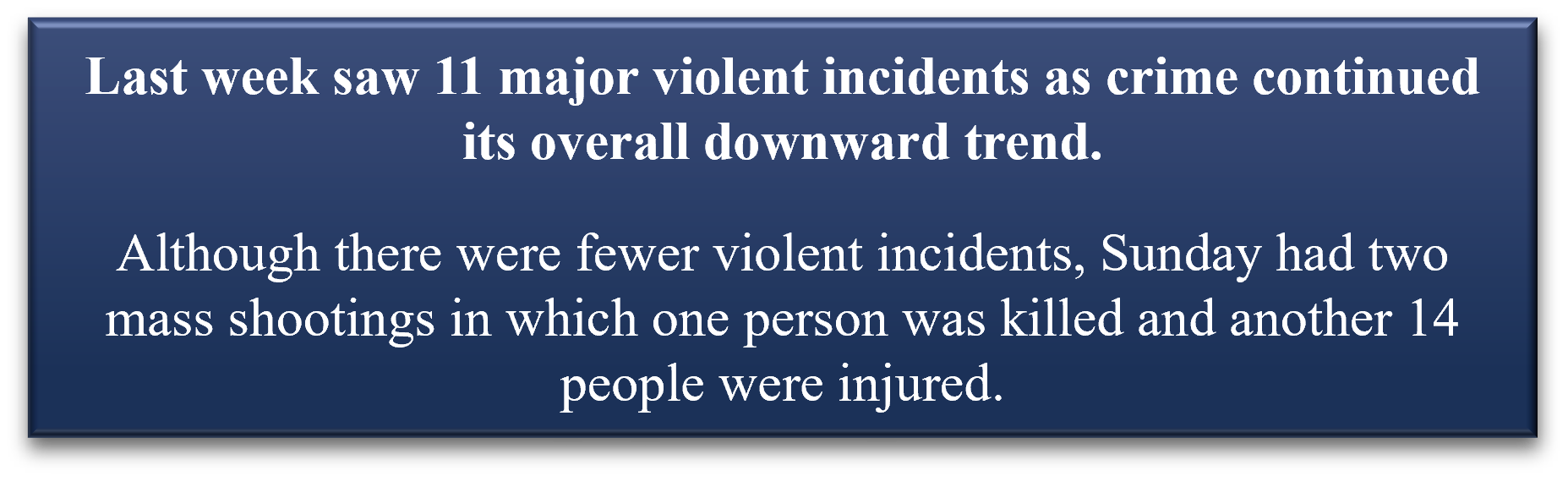 - Nonfatal shooting incidents are lower compared to every year since 2020.