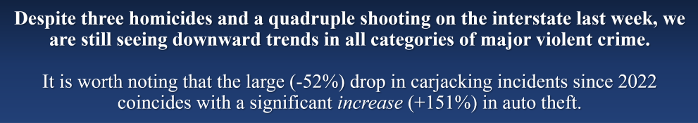 Carjacking incidents have decreased by 52% compared with the same time in 2022 – this is the largest decrease we have seen in any major violent crime compared with 2022.