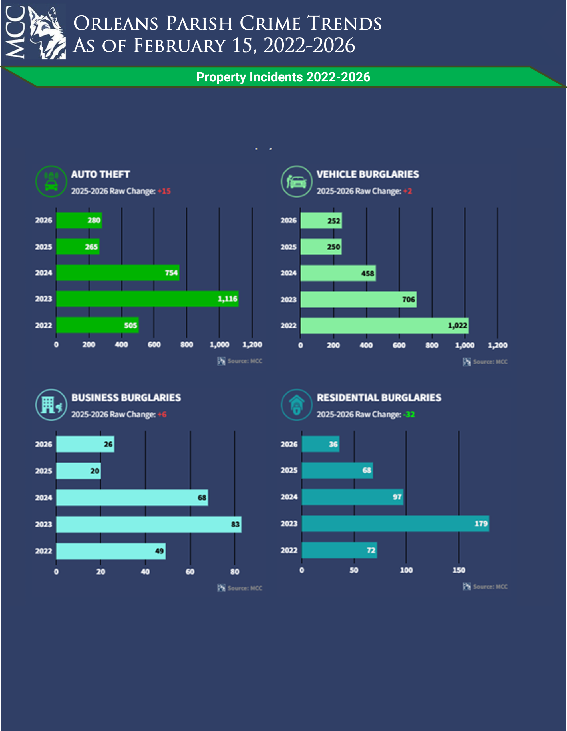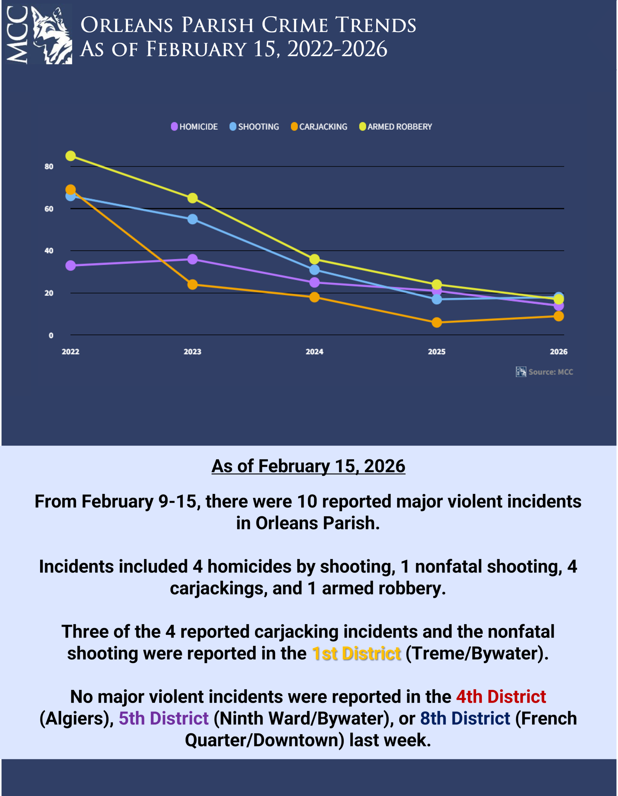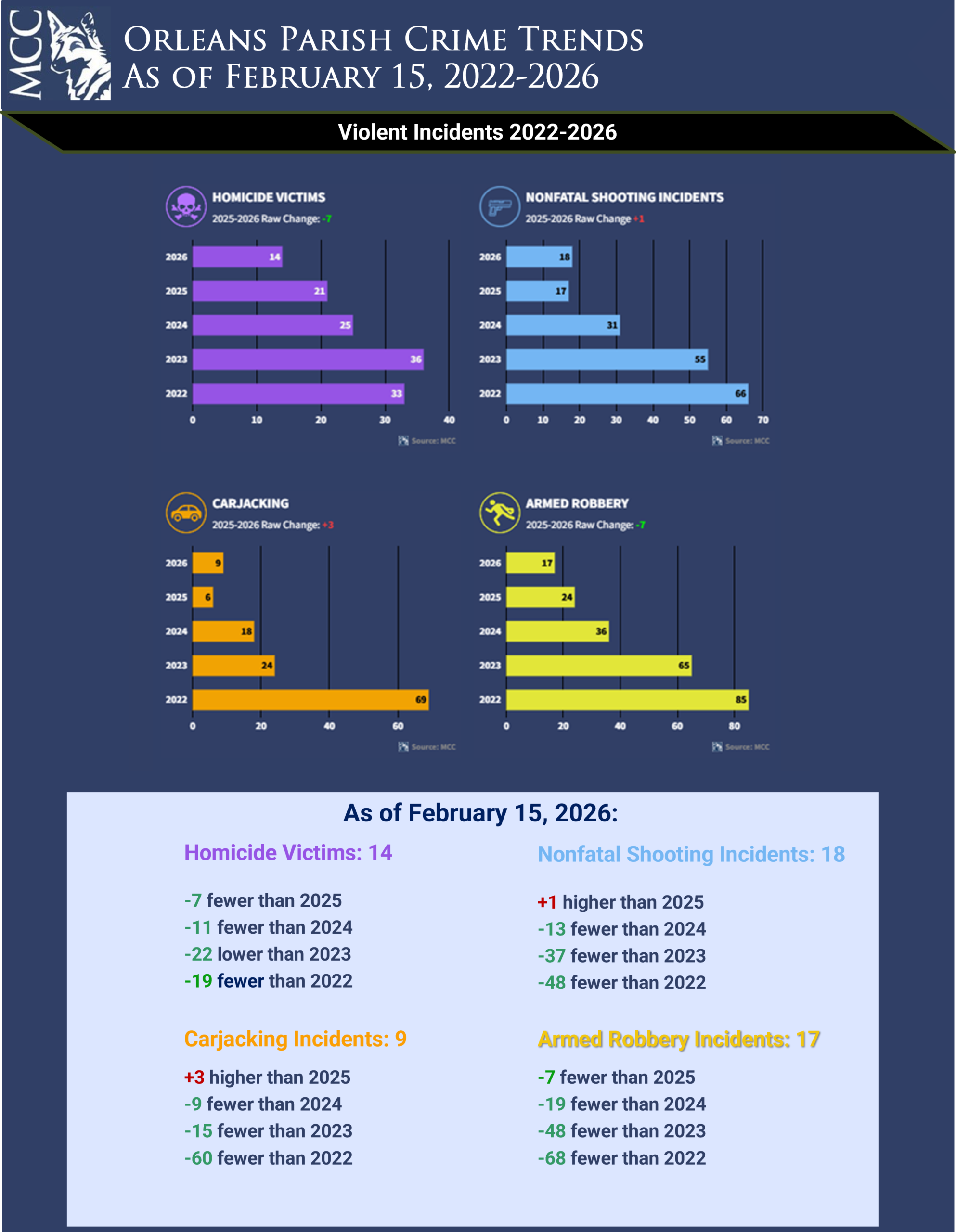 Download PDF February 23, 2026 Share this post Share on FacebookShare on Facebook Share on XShare on X Share on LinkedInShare on LinkedIn Post navigationPreviousPrevious post:Orleans Parish Inmate Snapshot: February 16, 2026NextNext post:Orleans Crime Trends: as of February 22, 2022-2026
