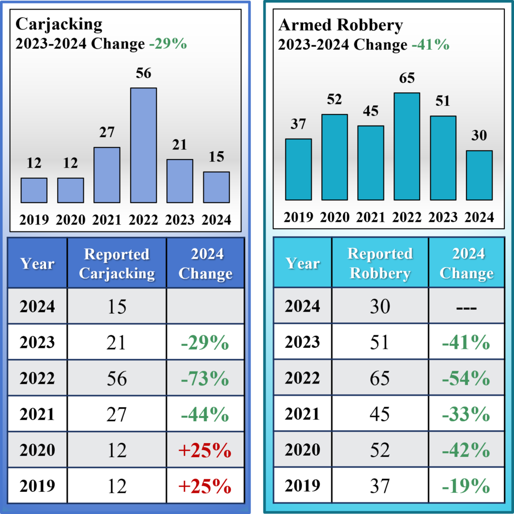 - In 2024 carjacking is -29% lower than 2023 and -73% lower than 2022.