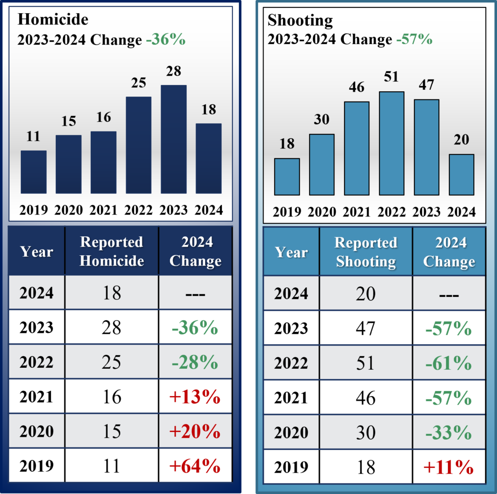 - Homicide in 2024 is -36% lower than 2023 and -28% lower than 2022.