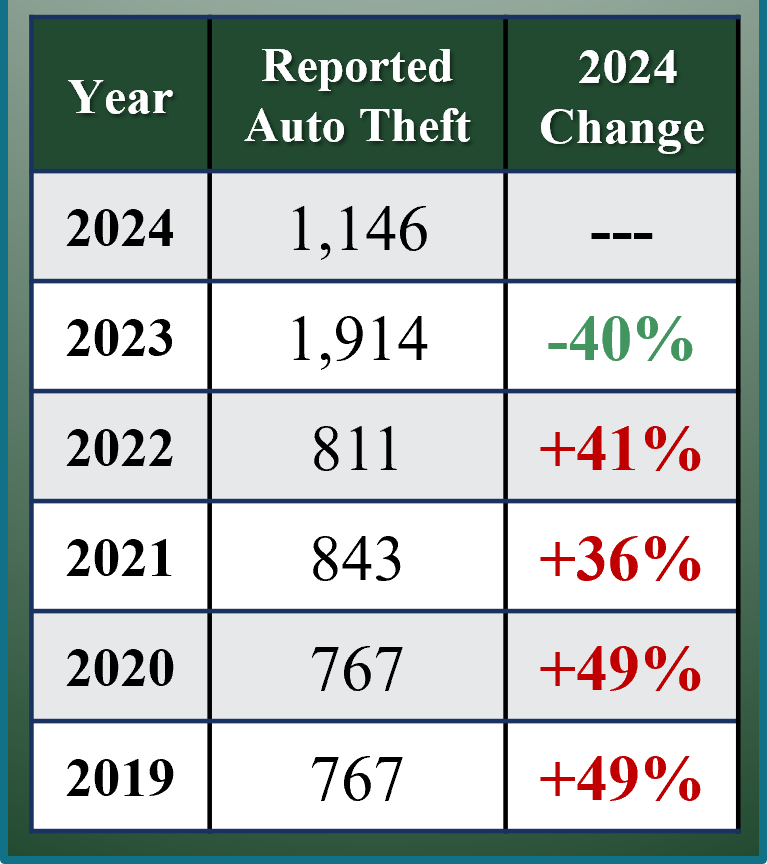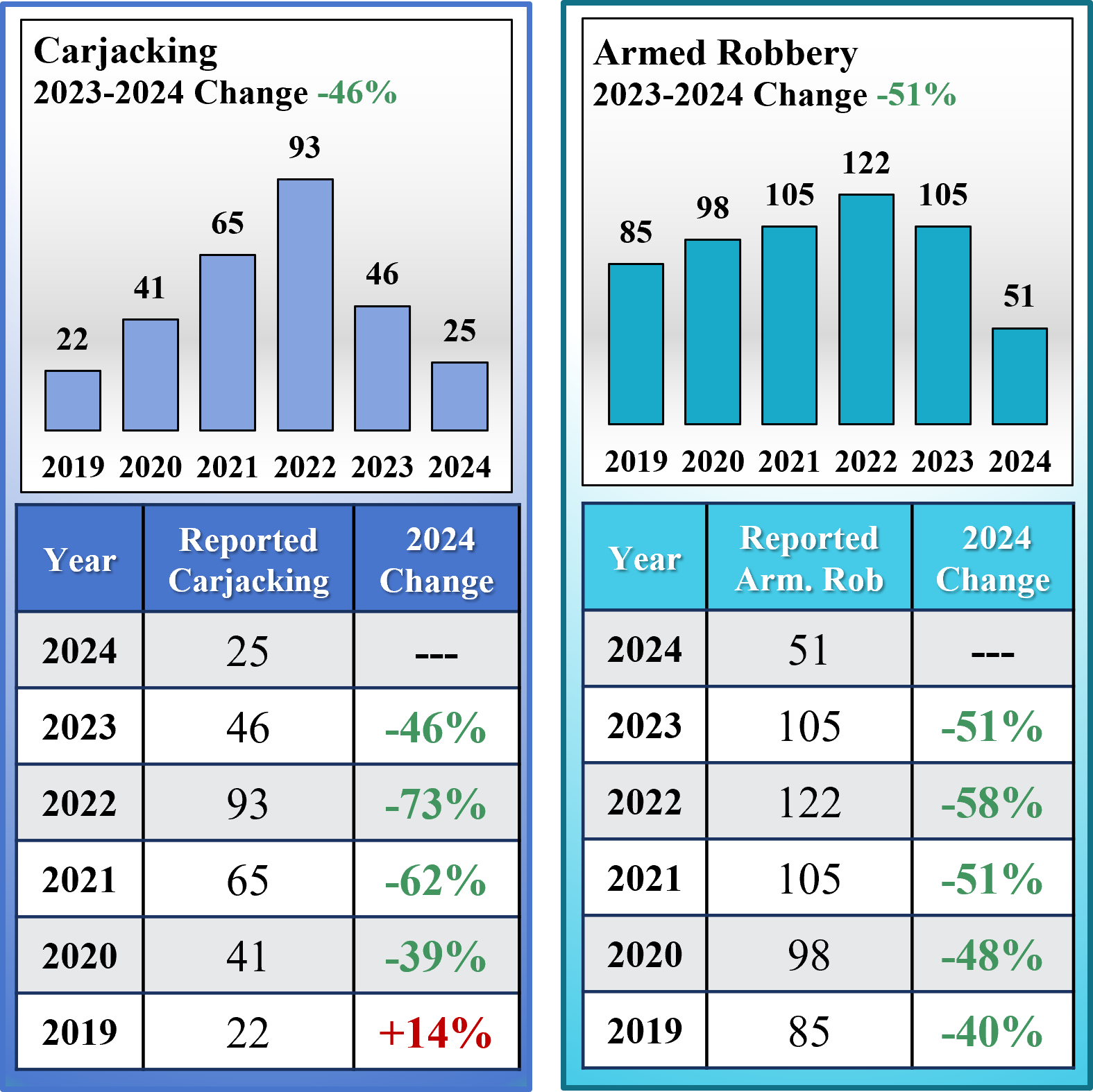 - In 2024 carjacking is -46% lower than 2023, -73% lower than 2022. and -14% lower than 2020.