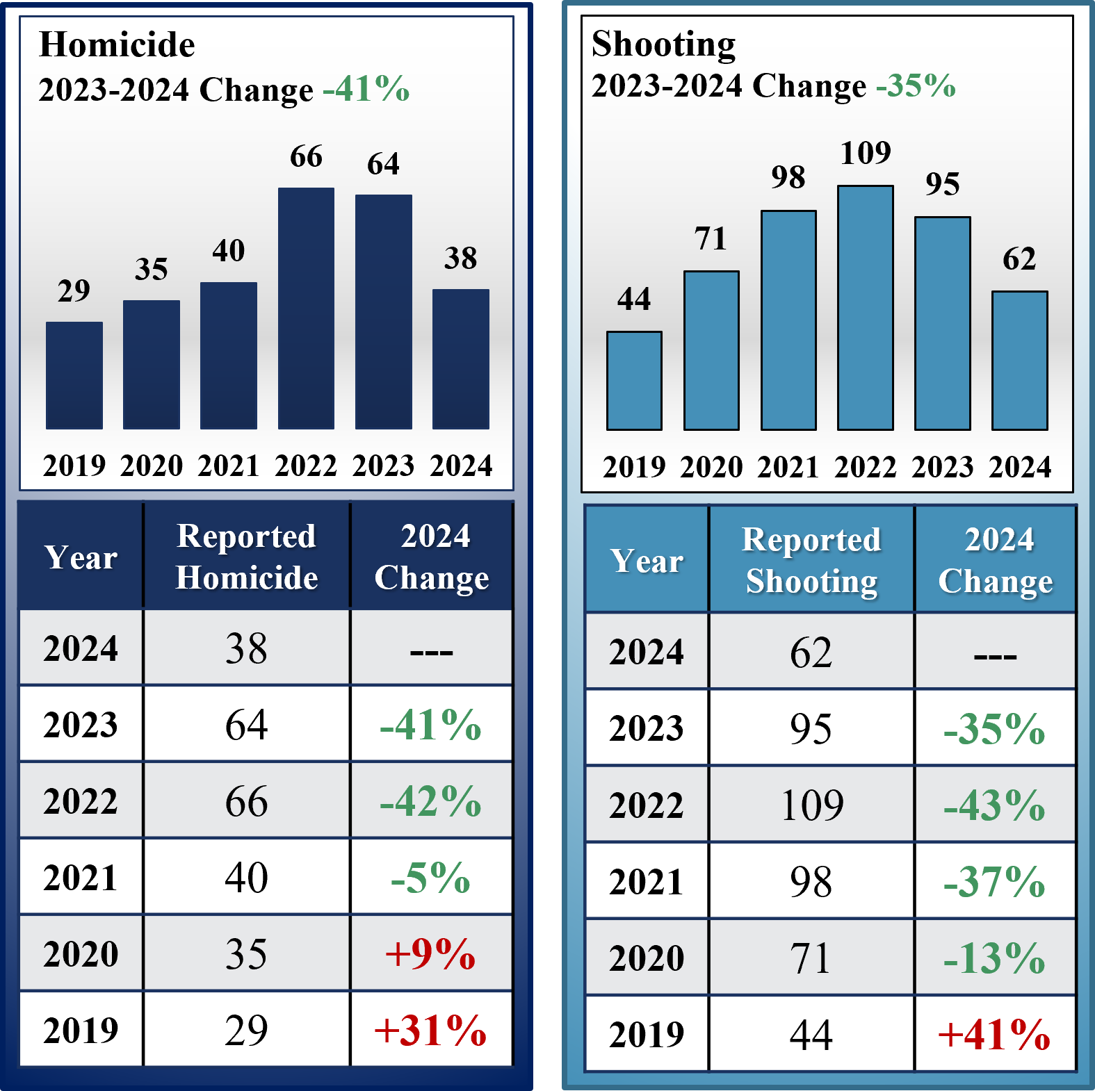 - Homicide in 2024 is -41% lower than 2023,-42% lower than 2022, and -5% lower than 2021.