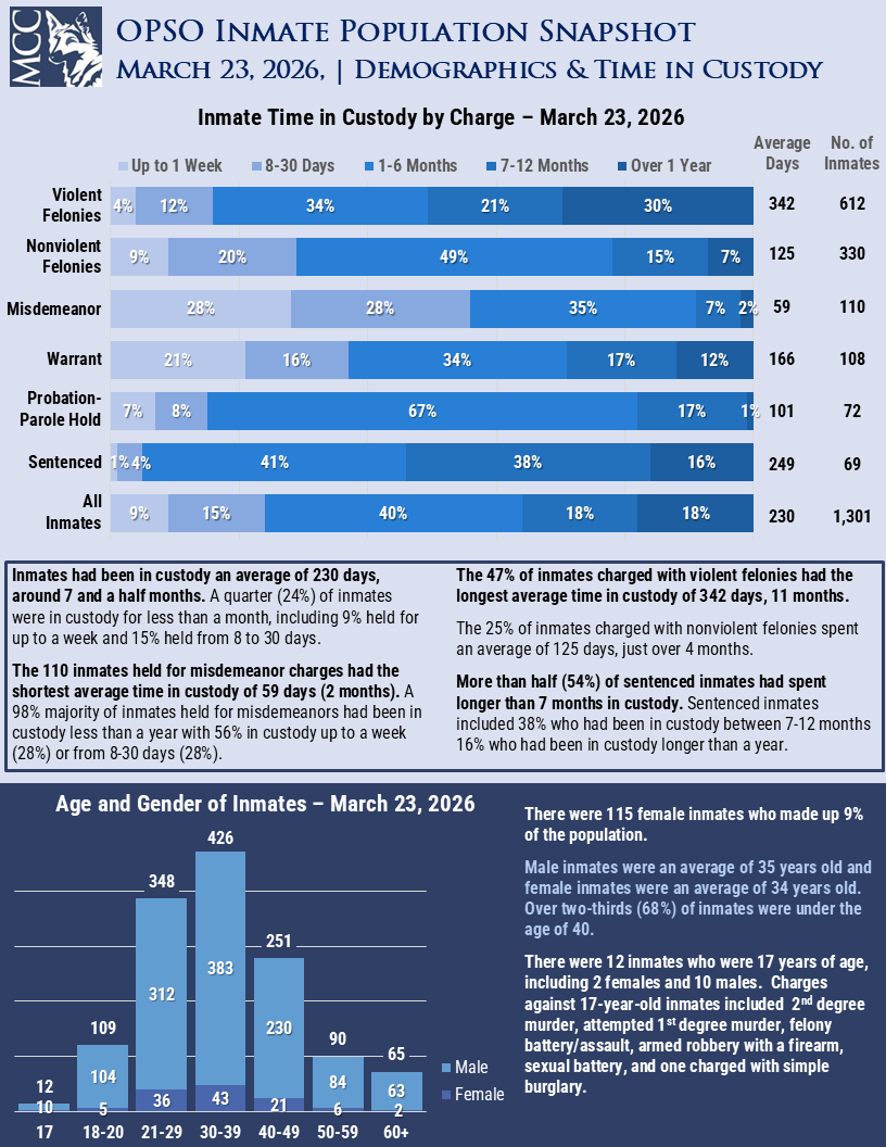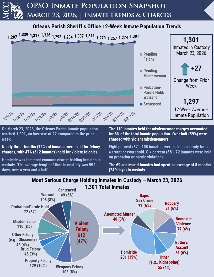 Download PDF March 24, 2026 Share this post Share on FacebookShare on Facebook Share on XShare on X Share on LinkedInShare on LinkedIn Post navigationPreviousPrevious post:Orleans Parish Inmate Snapshot: March 16, 2026NextNext post:Orleans Parish Inmate Snapshot: March 30, 2026
