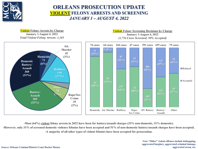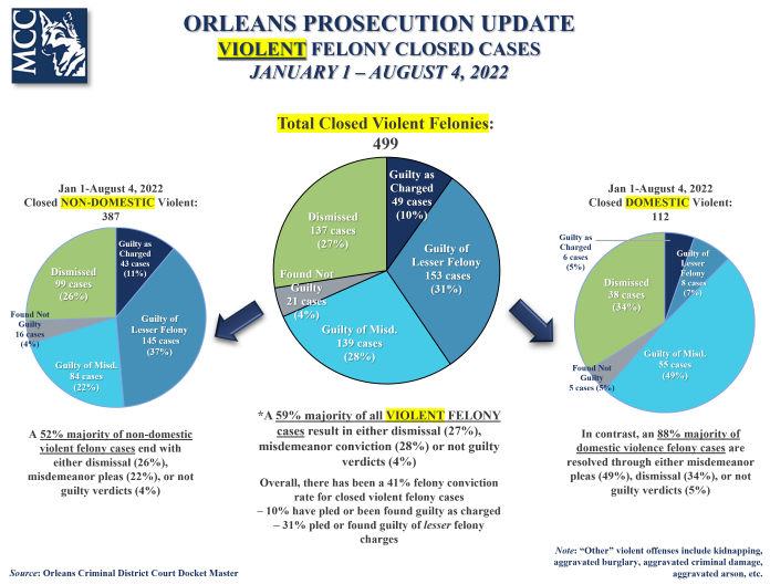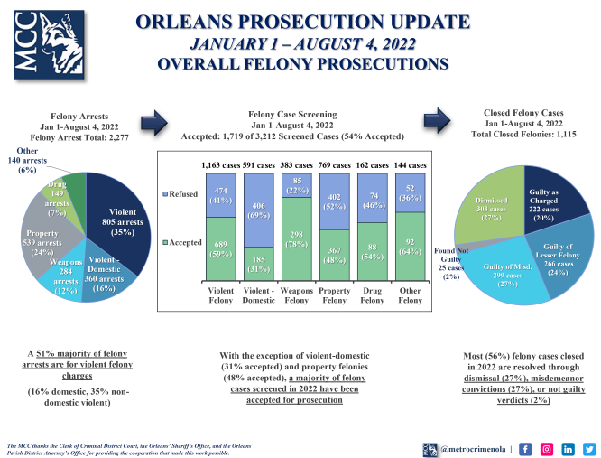SInce last week: Arrests 72 new felony arrests (29 violent felony) Case Screening 121 new screened felony cases (74 screened violent) 83 new accepted cases (47 accepted violent) Closed Cases 21 new closed felony cases (14 closed violent) 14 new felony convictions (9 violent felony convictions) August 10, 2022 Share this post Share on FacebookShare on Facebook Share on XShare on X Share on LinkedInShare on LinkedIn Post navigationPreviousPrevious post:8th District Crime Trends as of August 7, 2022NextNext post:Orleans Crime Trends as of August 14, 2022