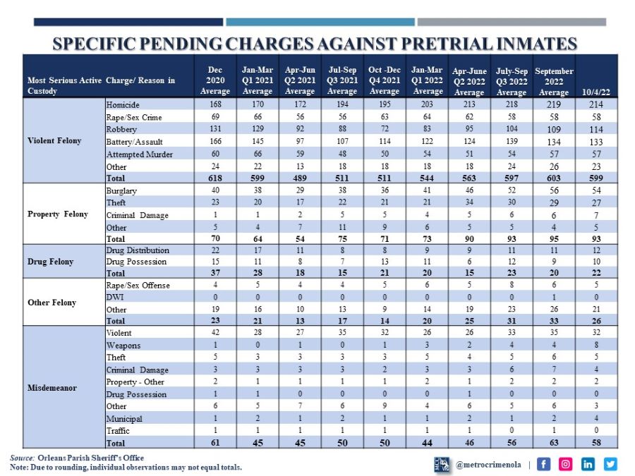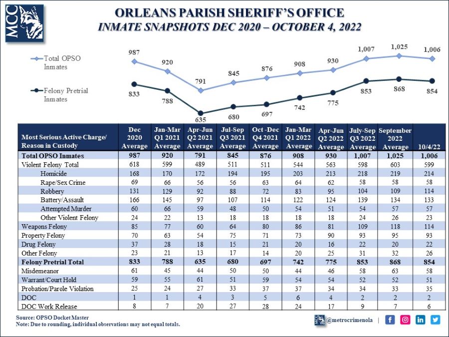 OPSO Inmate Snapshot October 4, 2022 Highlights Total Inmates: 1,006 85% (854 inmates) in custody on any felony charge 60% (599 inmates) in custody for a violent felony charge 21% (214 inmates) in custody for a murder charge October 4, 2022 Share this post Share on FacebookShare on Facebook Share on XShare on X Share on LinkedInShare on LinkedIn Post navigationPreviousPrevious post:Orleans Crime Bulletin as of October 2, 2022NextNext post:Orleans Crime Bulletin as of October 9, 2022