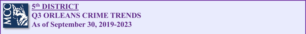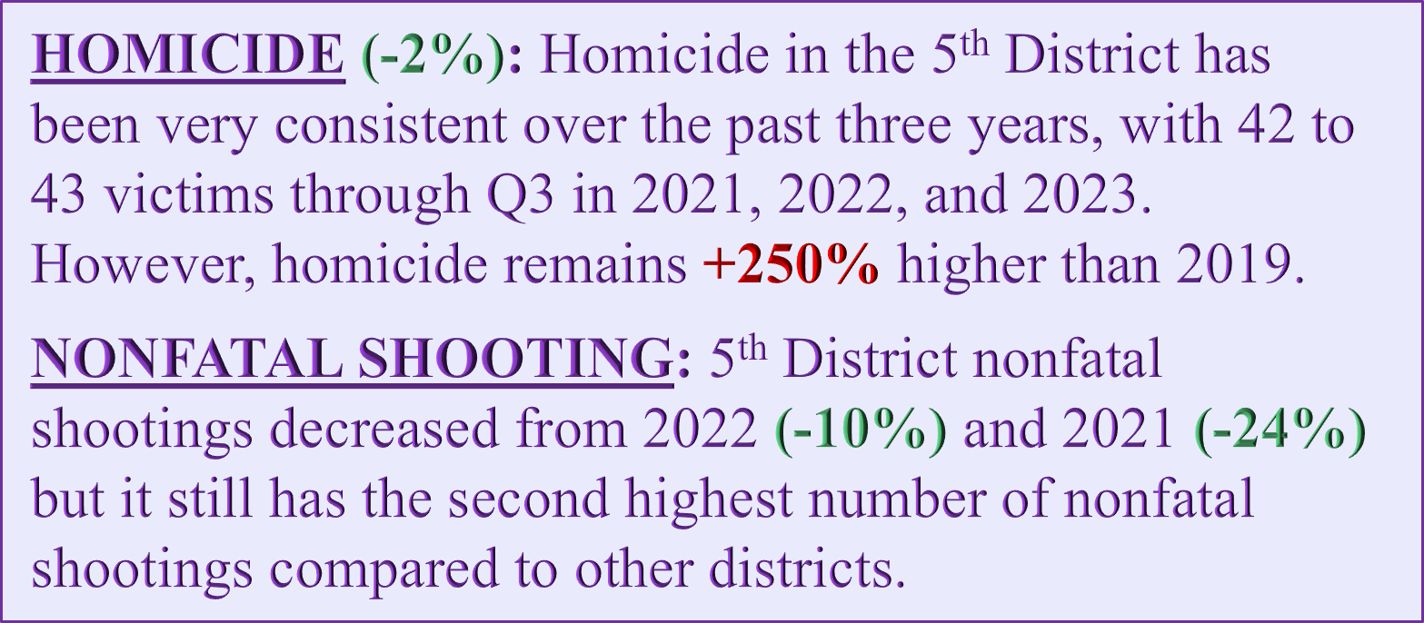 Although the 5th District shows reductions across all categories of major violent crime, it is still ranked 2 of 8 NOPD Districts on HOMICIDE, NONFATAL SHOOTING, and ARMED ROBBERY.