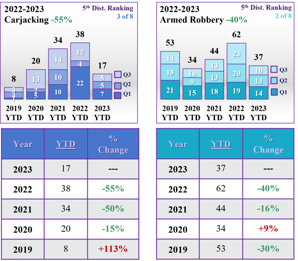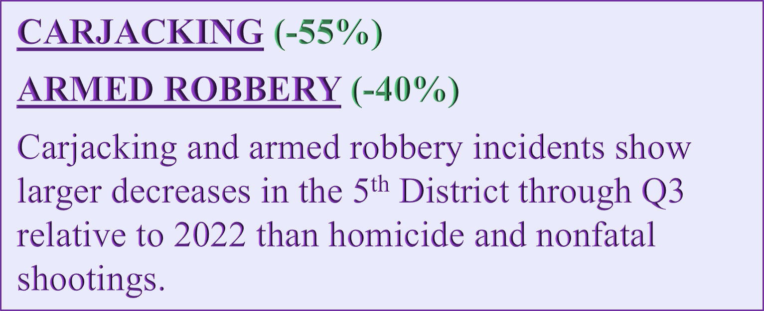 Carjacking (-46% citywide) and Armed Robbery (-31% citywide)