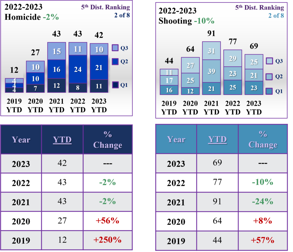 Homicide (-18% citywide) and Shooting (-17% citywide)